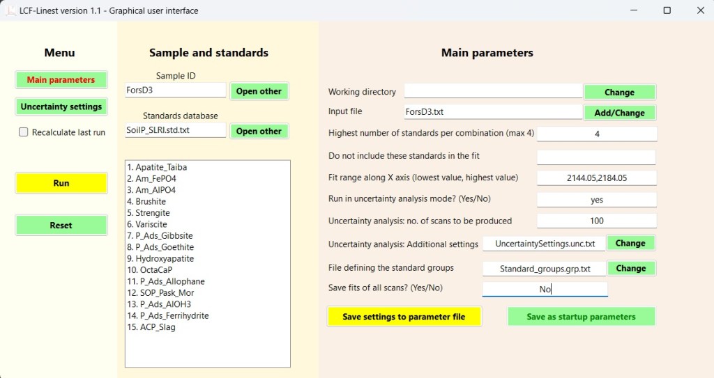 This software, written in C#, carries out linear combination fitting (LCF) using Microsoft Excel’s LinEst function. It is adapted to, but not limited to, use for XANES-LCF. The program is similar to the LCF option in Athena, but it runs much faster, which is of particular interest when carrying out uncertainty analysis calculations according to Gustafsson et al. (2020). Before using the program, you first need to produce merged and normalized XANES spectra in other software such as Athena or Larch. A pdf guide accompanies the program to get you started. To use this software, you need to have a 64-bit Windows operating system (at least Windows 10), and Microsoft Excel should be installed.
